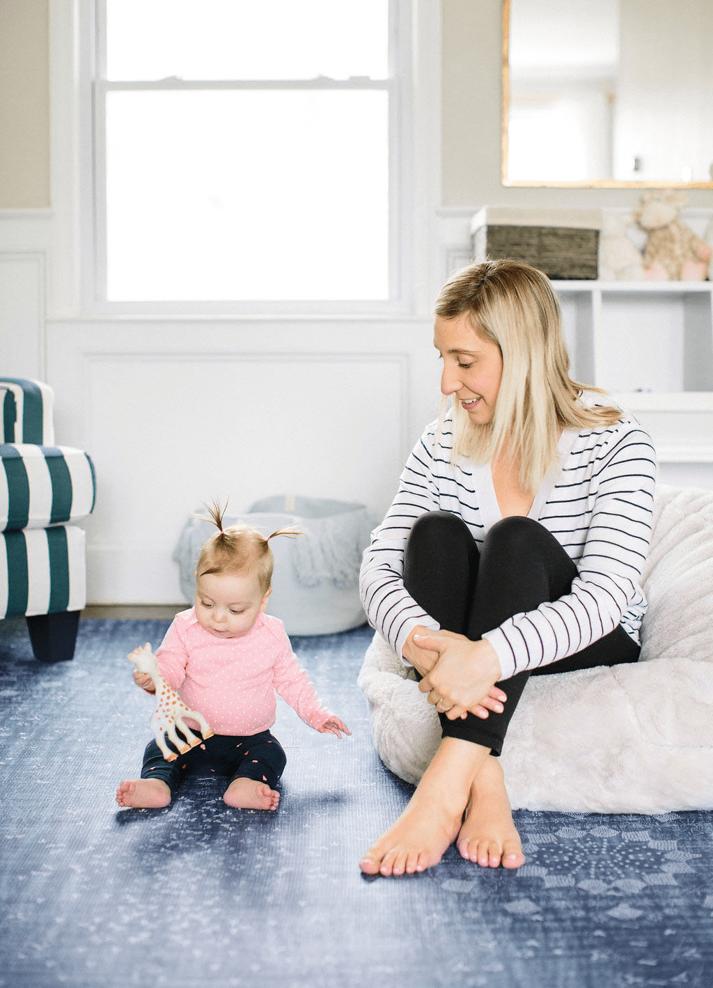 After a week of using the space, Anel and I realized that we needed some place for us to sit because our backs were starting to hurt from being on the floor all the time. I bought a super soft and cozy faux fur bean bag chair and brought up my favorite ever striped chair (made by my friend Roxy!) that had been sitting in the basement for six months gathering dust. I use the chair to feed her bottles, and sit with her on the bean bag chair while she plays. If Anel and I are both hanging out, we both have a place to sit which is nice too.