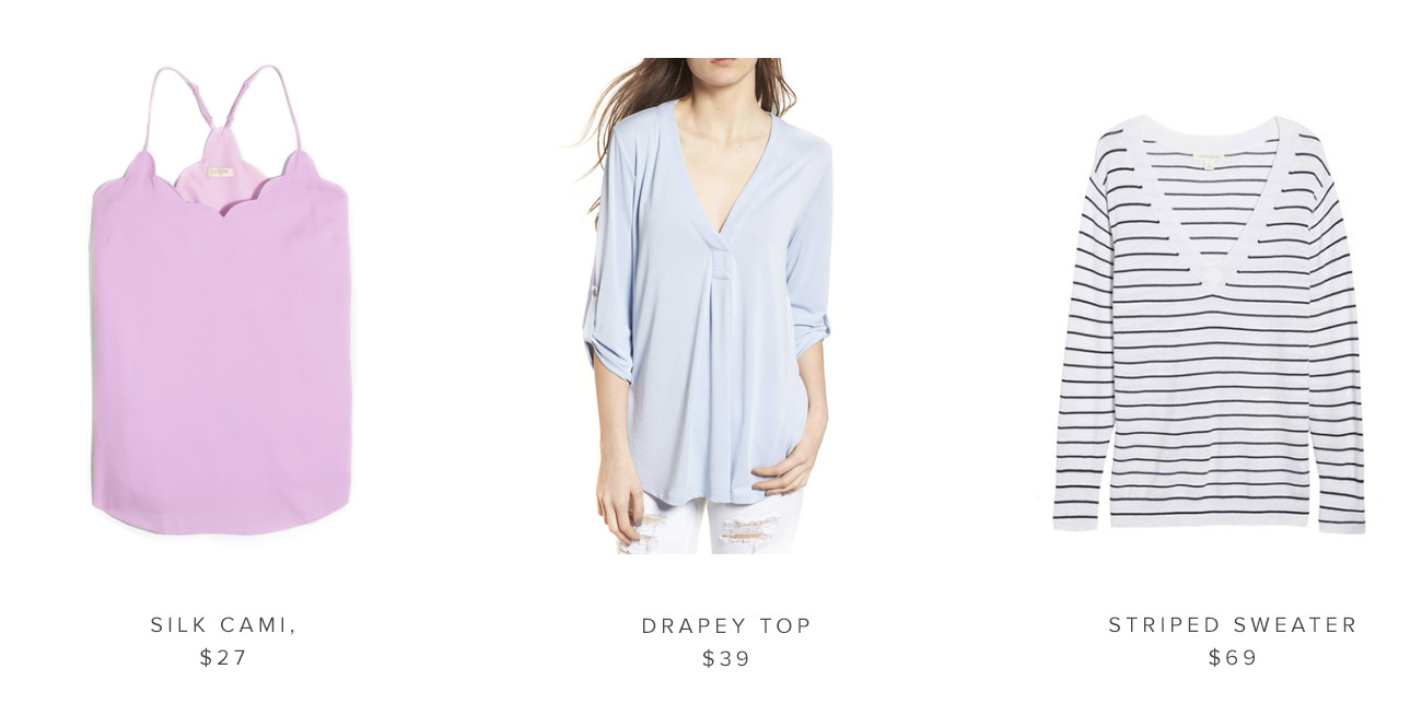 Transition pieces like this scalloped cami (50% off and comes in six colors) make for great layering pieces now and stand-alone looks come summer. My sister and I both have this drapey silk shirt in multiple colors and it’s less than $40 which makes it a crazy steal. I also just picked up a striped sweater that has the perfect v neck and fit. I’ll be sharing it in an outfit post soon.