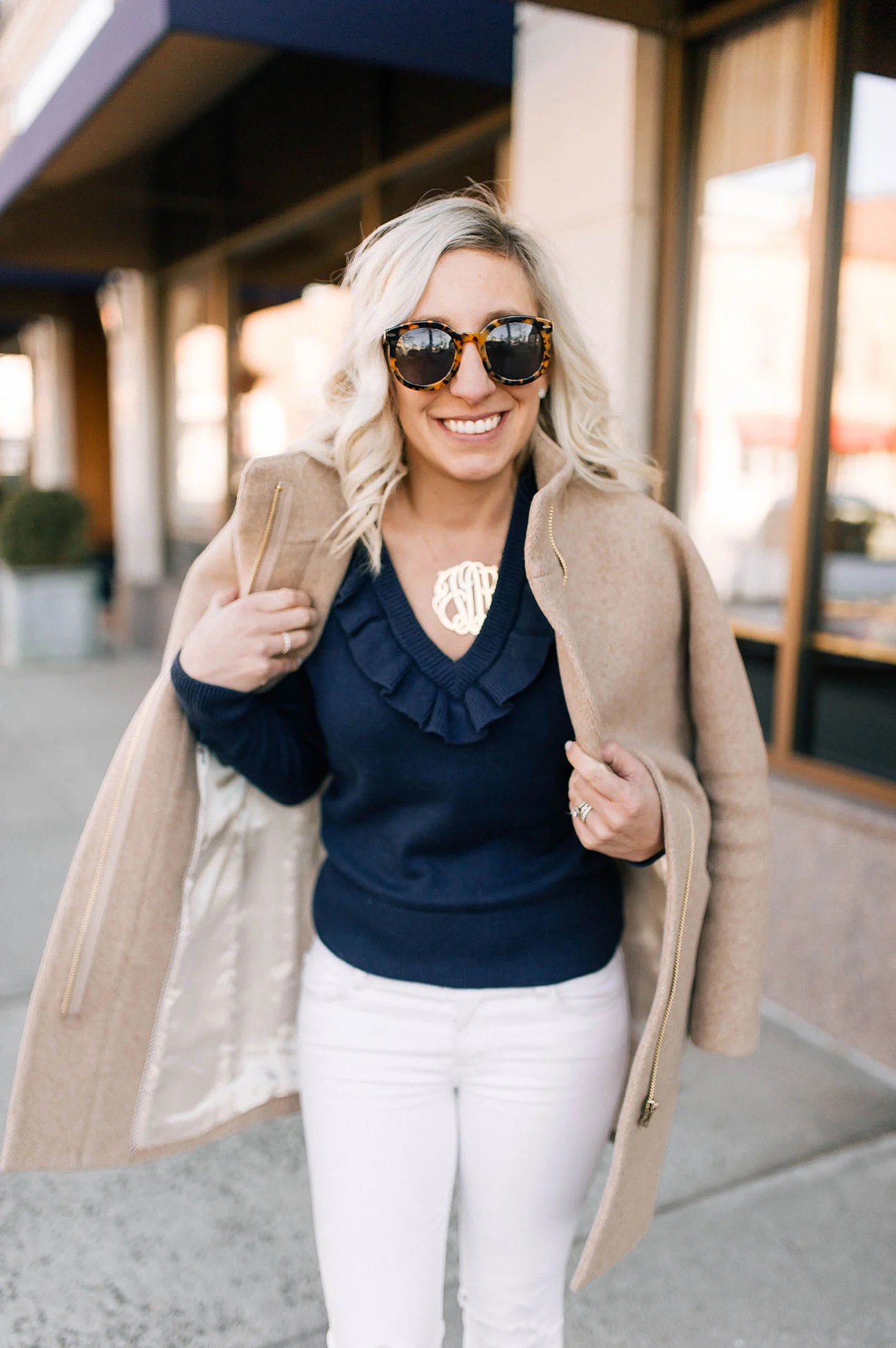 J.Crew Ruffle Sweater / J.Brand Jeans / J.Crew Coat (on sale here) / M.Gemi Amico Booties c/o / Monogram Necklace (size 3XL) / Karen Walker Sunnies
