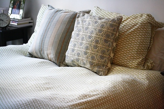 For the last 2 years, Anel and I have been using a duvet cover that I impulse-purchased at Ikea for $19.99. The pattern was cute, but the cut was so bad that the comforter always looked lumpy and oddly-shaped. There were no buttons, so you could always see the white duvet sticking out of the bottom. We used two Pottery Barn throw pillows to fancy it up a bit but it always felt so high maintenance!
