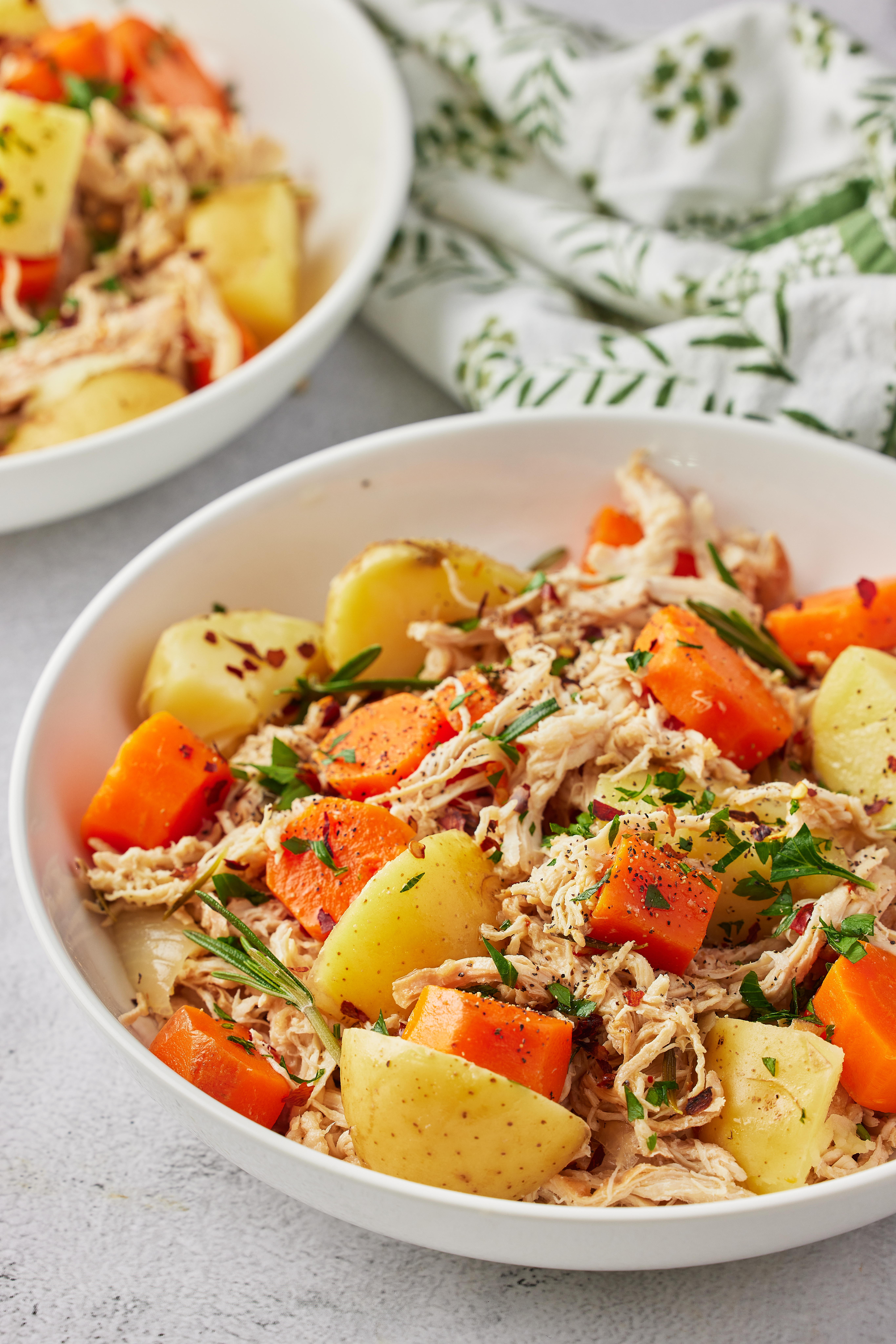 - Add the carrots, onion, and potatoes to the slow cooker. Place the chicken on top of the veggies.