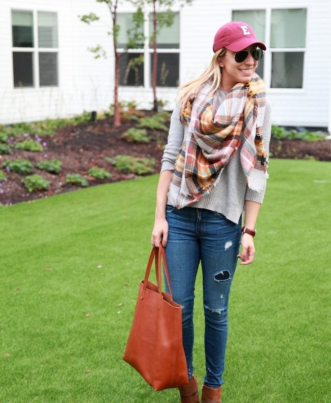 Madewell Sweater and Transport Tote, J.Crew jeans, Zara scarf, c/o Marc Fisher booties, Daniel Wellington watch Last year I was SUPER jealous of everyone who was able to snag the plaid blanket scarf from Zara....